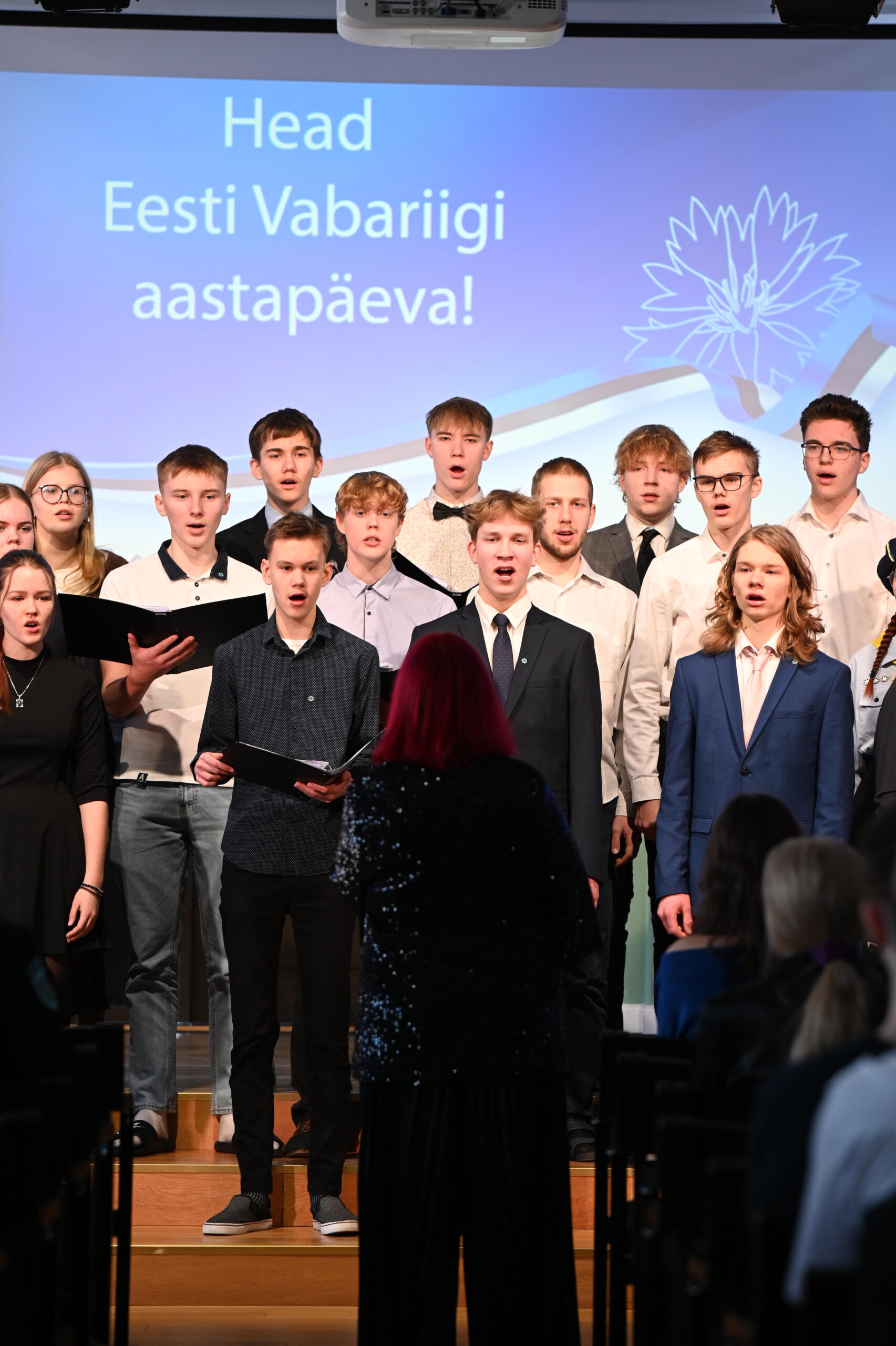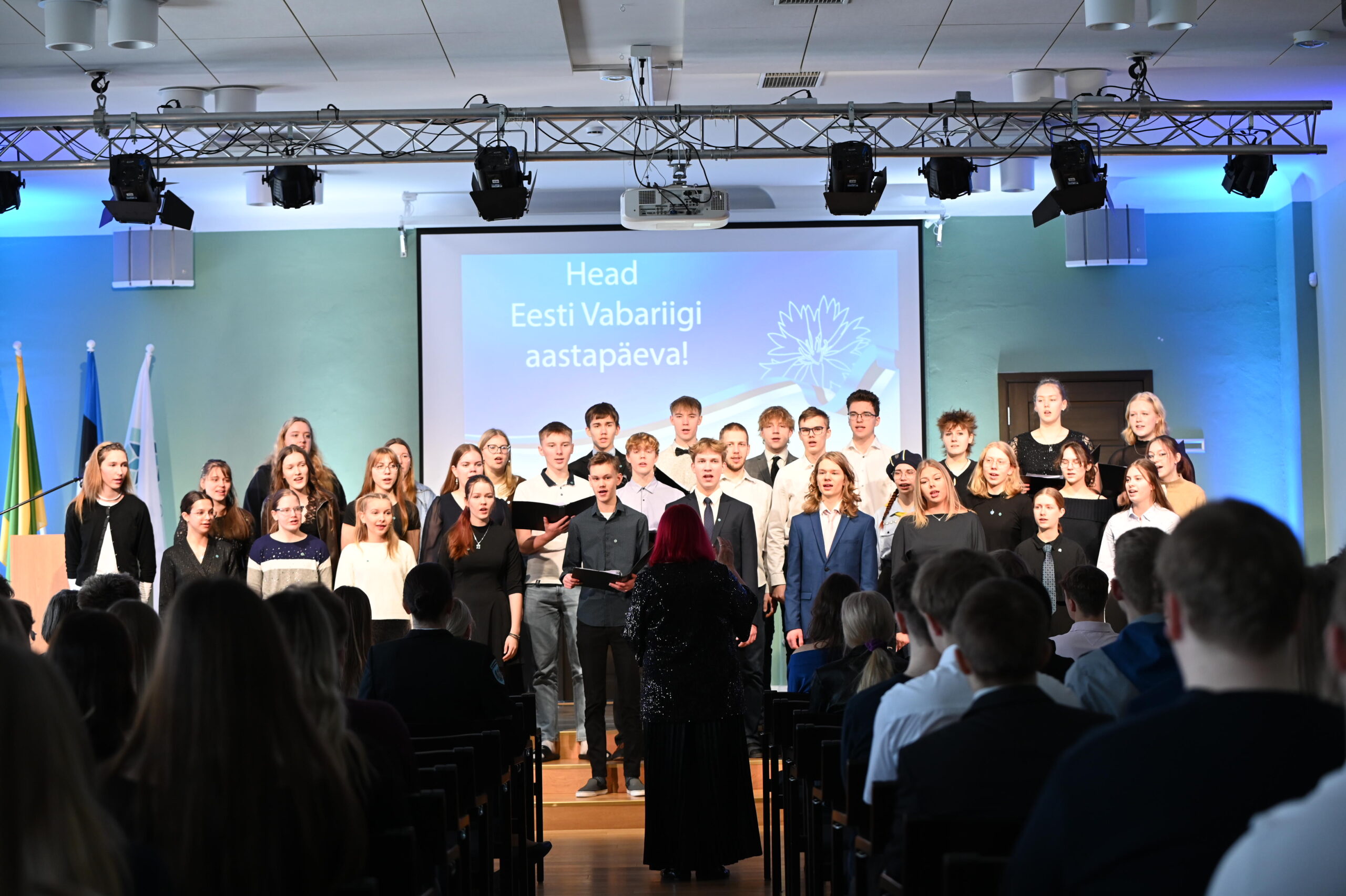 Võru Gümnaasiumis tähistati täna, 20. veebruaril, piduliku aktusega Eesti Vabariik 108 aastapäeva. Aktusel esines Võru Gümnaasiumi segakoor õpetaja Silja Otsari juhendamisel, kõne pidas koolidirektor Karl Kirt ning G2 mooduli “Mõtte lugu” õpilased tõid õpetaja Tarmo Tagametsa juhendamisel lavale omaloomingu “Lühikroonika. Eestlane peol.”